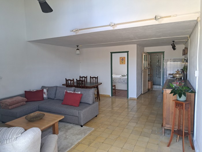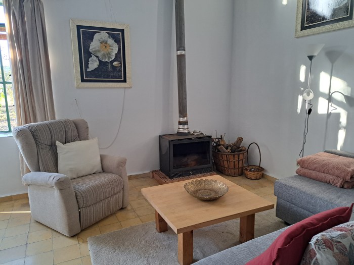 De woonkamer is warm en sfeervol, met een houtkachel die voor een gezellige avond zorgt tijdens de frissere maanden. De zetel kan worden uitgeklapt tot een extra bed van 1m40 breed, waardoor het appartement comfortabel plaats biedt aan maximaal vier personen. Er is ook airconditioning (warm en koud) voor een aangenaam binnenklimaat het hele jaar door.
