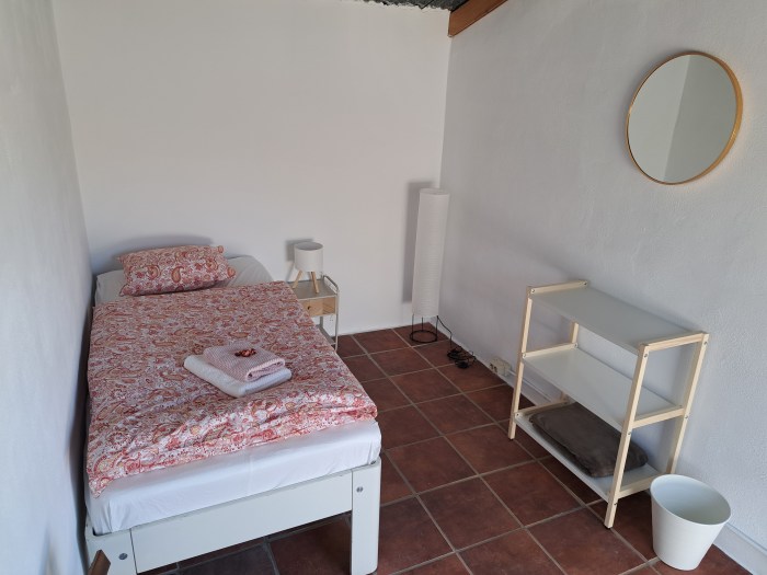 Deze eenpersoonskamer is een lichte, knusse plek met een heldere en zachte uitstraling. De frisse, rustige kleuren en eenvoudige inrichting maken het een ideale kamer voor wie ruis wil loslaten en opnieuw ontspanning, focus en helderheid wil vinden.